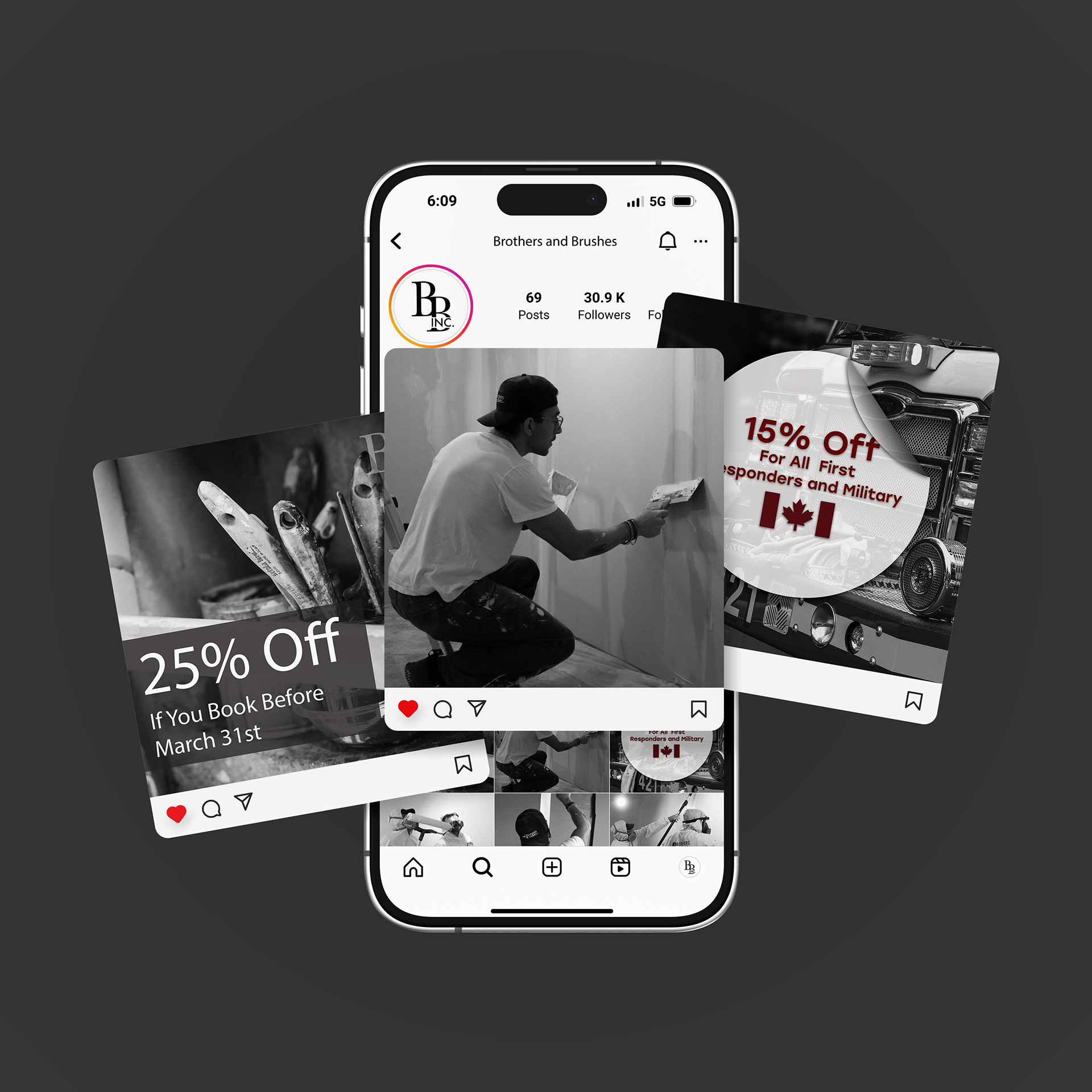 Brothers and Brushes is a Milton-based painting company with a bold, modern brand identity. I created a logo that emphasizes simplicity and sophistication. The sharp, blocky sans-serif typography adds a contemporary edge, reflecting the company’s clean, precise work. Along with business cards, car magnets, and door hangers, I also provided photography and am currently developing a website to showcase their services in the same sleek, professional style.